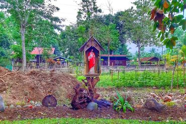 Cabanglasan has the most number of chapels in the Bukidnon Mission District. Many are located far and wide across sitios and barangays, some on mountain slopes and others accessible only on trails by motorcycle or on foot. They are built on land donated by the local parishioners with simple structures constructed, many with bamboo and lumber from locally sawn timber, and labor provided by the residents. Some were funded with seed money from generous donors, but many were completed by the devotees themselves from farm income and contributions from overseas workers.