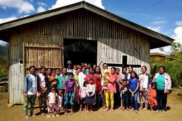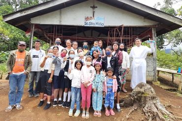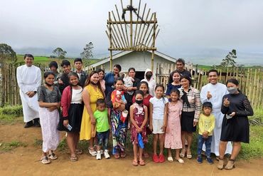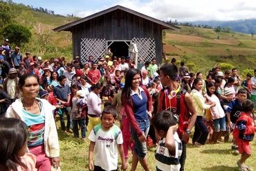 Miarayon has about 15 mission chapels. Many are located far and wide across sitios and barangays, some on mountain slopes and others accessible only on trails by motorcycle or on foot. They are built on land donated by the local parishioners with simple structures constructed, many with bamboo and lumber from locally sawn timber, and labor provided by the residents. Some were funded with seed money from generous donors, but many were completed by the devotees themselves from farm income and contributions from overseas workers. Photo shows parishioners of Our Lady of Fatima chapel in Tankulan, Lirongan.